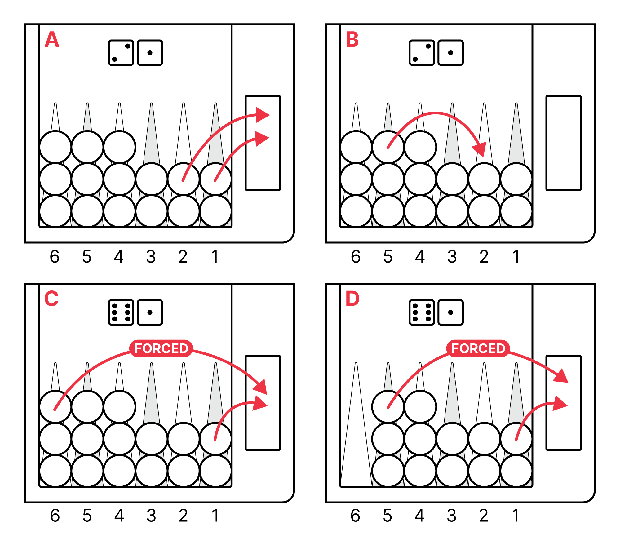 If you roll a number higher than the point you have checkers on (D), you must take off checkers from the backmost point containing checkers.